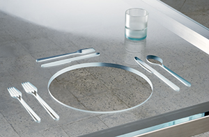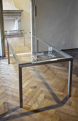 La tavola riunisce simbolicamente aspetti del vivere in ritualità rassicuranti e propiziatorie. In epoca romana venivano addirittura affermati parallelismi tra micro e macro cosmo (vedi la cena di Trimalcione). Ma è anche un “luogo” che rimanda altrove, a valori meno evidenti, seppur intrisi di significati sottili. Questa tavola è un potenziale campo di battaglia, dove postazioni opposte o contrapposte, si misurano; si attuano trattative di armistizi annunciati e forse mai definiti. Afferma valori bilaterali che non costituiscono una risposta alla verità, si pone piuttosto come interrogativo su una linea di confine immaginaria, un filo rosso, che divide e accomuna, allo stesso tempo, come nei contenziosi di diaspore passate e presenti. È una metafora per un dialogo annunciato e mai realizzato. Un piano desertico, triste, avvilente e spoglio, senza nulla da servire. Una rappresentazione, come in un palcoscenico, dove può succedere di tutto e tutto si annulla. S.R.