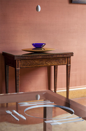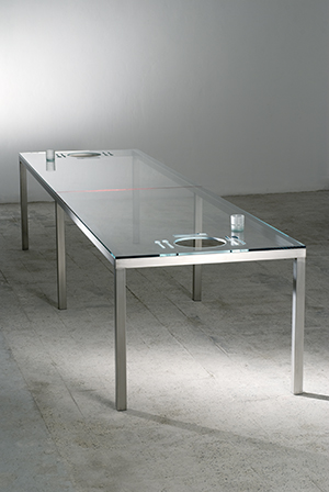 The table symbolically reunites several propitiatory ceremonies and rituals. In Roman times, parallels were drawn between the micro- and macrocosm (see Petronius’ Banquet of Trimalchio). It is also a “place” that evokes another condition or situation fraught with subtle meanings. This table is a potential battlefield, where opposing or conflicting positions are pitted against each other, heralding the negotiations of many an armistice never concluded. This table reiterates bilateral values that do not constitute an answer to the truth but rather raise issues that question the very boundaries of the imaginary. A red line drawn midway both divides and unites, as with past and present diasporas.This is a metaphor for dialogue, announced but never achieved: a plan abandoned, made barren, serving nothing; a portrayal of things, as if on stage, where anything can happen and everything is undone. S.R.