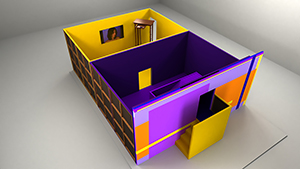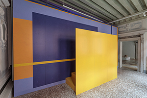 The apparently simple architectural system therein is comprised of walls that, on closer inspection, are large canvases mounted on stretchers. The exterior’s decoration plays off the stretchers’ structural elements and their arrangement; on seeing the wall in its entirety, it appears to be an immense geometric painting comprised of shapes in shades of yellow, indigo and blue. Yellow is used as a symbol of light and therefore of knowledge and rationality; blue, with its reference to the night and the oneiric, is linked to the instinctive, unconscious and irrational. Elena Forin.