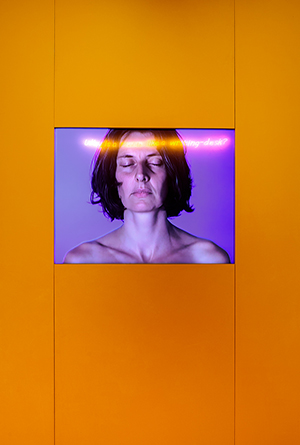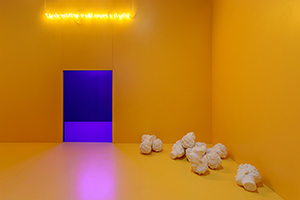 This projection on the ceiling initiates Silvano Rubino’s contribution to Alice in Doomland. The infinity of the blue vault is broken by the appearance of phrases that alternate, decompose, explode, disappear, reconfigure: ‘Who are you?’ but also ‘How long is forever? Sometimes just a second’, ‘I don't know. I am not. I am not me’ and ‘I don't know who I am. I know who I was. I don't know what I will be. Who am I then?’. These questions - at times distinct, at times overlapping - set the stage for our passage to the great work in the next room, enticed by its intensely coloured surfaces.