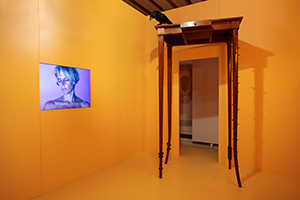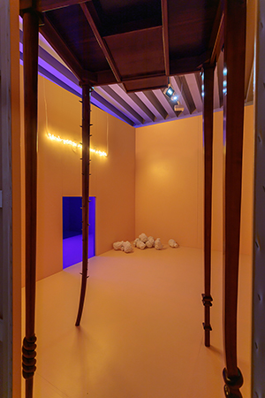 Comincia dal video proiettato a soffitto il percorso che Silvano Rubino ha creato per Alice in Doomland, in cui l’infinito della volta azzurra è spezzato dalla presenza di frasi che si alternano, si scompongono, esplodono, scompaiono e si ricompongono. “Chi sei?” ma anche “quanto tempo è per sempre? A volte solo un secondo”, “io non so. Io non sono. Io non sono io” e “io non so chi sono. Io so chi ero. Io non so cosa sarò. Chi sono dunque?”: queste domande preparano il terreno per la grande opera della sala successiva, che accoglie i visitatori attraverso le sue superfici intensamente colorate. Si tratta di una struttura architettonica dall’impianto apparentemente semplice, costruito con delle pareti che a ben guardare sono delle grandi tele intelaiate.