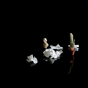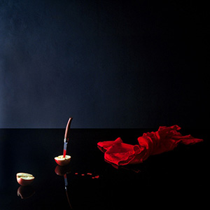Il tema della natura morta nasce dal desiderio di dar voce a oggetti che, normalmente, consideriamo inanimati. Talora ne esce l’aspetto drammatico della rappresentazione, altre volte, invece, un’essenzialità giocosa. Le immagini sono riflesse su un piano nero che non si distingue dallo sfondo, creando un doppio, a volte, inquietante. Tutte le cose hanno in sé un’identità forte ed esprimono la loro unicità, al punto di creare forti rimandi emotivi. Gli oggetti raccontano la loro storia e inducono alla curiosità, a voler sapere chi ne ha goduto, possedendoli. O se ci sia, invece, qualche mistero da svelare. S.R.