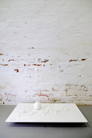 The lead line hanging over the pomegranate shifts our attention to the fruit, creating a tension between masculine and feminine. The disordered overflowing of words that fertilize communication like scattered seeds becomes thought. Beyond appearances, it invites us to consider the non-evident as a reference to the essence of things. S.R.