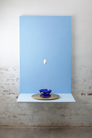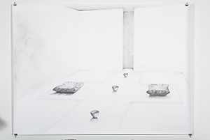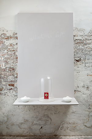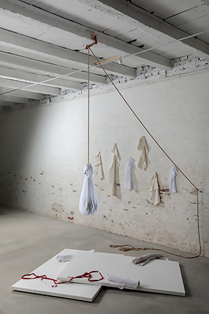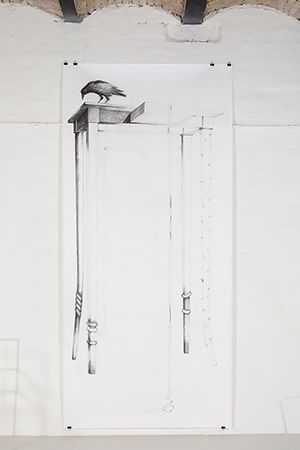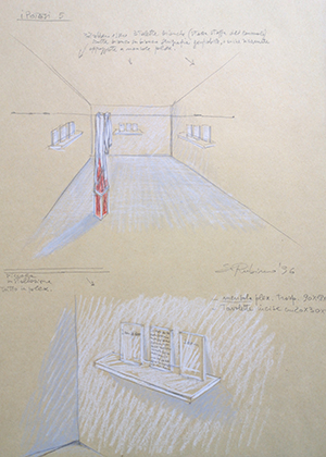 Prima viene il tratto, che dà forma ai sogni. Quello minuto, preciso e assieme eterodosso, dedicato ai bozzetti delle installazioni. Quello tracciato col gesso, a pancia in giù, in fornace. Da lì discende, come logica funzione, tutto il resto: l’à-plat della tinta nelle tele, il rosso sontuoso, teatrale, usato con parsimonia nelle foto, persino la scelta dei materiali.