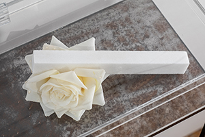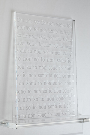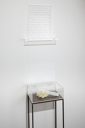 A white book, Bianco nel bianco, contains white pages, on which virgin words have yet to be written. And a prophetic photo shows us the boy posing with a camera hanging around his neck. On the opposite side a transparent box contains a white rose, its petals kissed by dewdrops, crushed by a block of white marble. A little above it is a sort of transparent plaque with phrases written on it that say: Io non so io non sono io non so io non sono io… (I do not know I am not I do not know I am not I…) until they cover it completely. S.R.