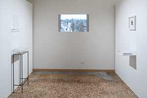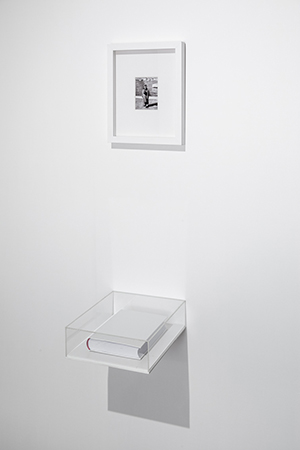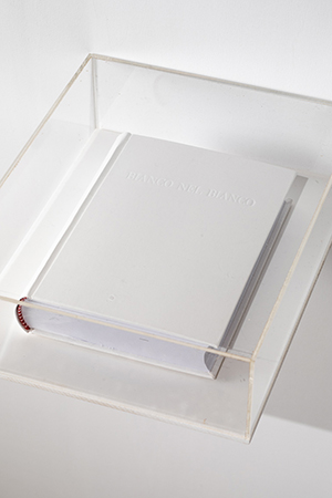 Un libro bianco, Bianco nel bianco, custodisce pagine bianche, sulle quali parole finora vergini non sono ancora state scritte. E una foto profetica ci propone il bimbo in posa con una macchina fotografica appesa al collo. Al lato opposto, una scatola trasparente ci mostra una rosa bianca, dai petali baciati da gocce di rugiada, schiacciata da una barra di marmo bianco. E poco sopra una sorta di lapide trasparente ha incise delle frasi circolari che dicono: Io non so io non sono io non so io non sono io… fino ad occuparla interamente. S.R.