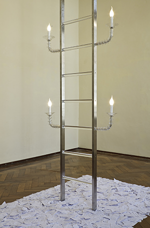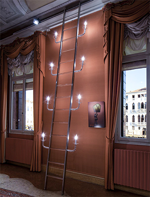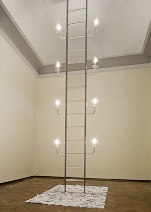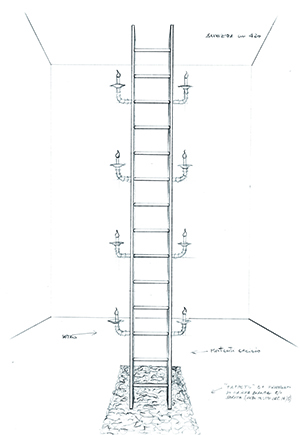 La scala, soggetto simbolico per eccellenza, rappresenta il collegamento tra terra e cielo, fra vivi e morti, la comunicazione tra il terreno e il divino. È la possibilità di accedere al cielo. Sia in ambito laico, sia in quello religioso rappresenta il passaggio da uno stato di conoscenza a un altro, il collegamento con una sfera superiore. Raffigura il processo di crescita dell’uomo, l’ascesa progressiva verso la consapevolezza del sé. E i gradini sono i livelli intermedi per arrivare a una verità superiore. Questa scala ironizza se stessa, ciò che rappresenta: é una scala “illuminante” e, nel contempo, riafferma il suo potente valore evocativo. S.R.