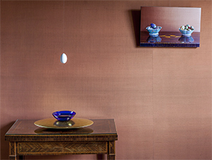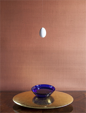 Due coppette di ceramica cinese contenenti uova decorate sono state sostiuite da una coppa di vetro blu colma d’acqua distillata, appoggiata su una forma ovaloide piatta dorata, smussata, affilata sui bordi. Un uovo bianco è sospeso sopra di essa. L’uovo è simbolo di vita in varie culture e nel cristianesimo di resurrezione. L’oro in arte è sinonimo di luce divina. Il blu è il colore della spiritualità. L’acqua l’elemento da cui ha inizio la vita. S.R.